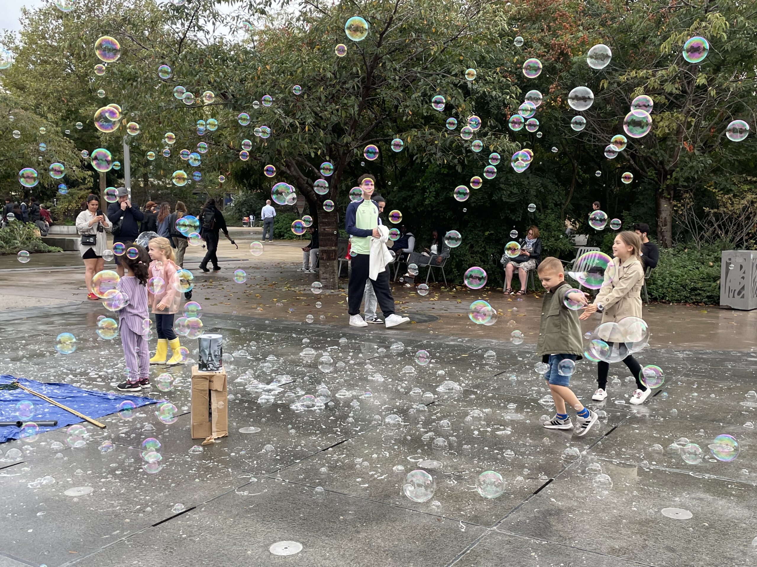 Bulles dans le jardin es Halles, les enfants sont ravis et essaient de les attraper