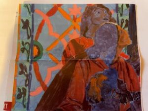 Or, ici, il y a une erreur manifeste : ce qu’on voit, des personnages, (il y a 2 personnages, 2 femmes) , du personnage le plus proche de nous, c’est un gros pâté mauve qui est son foulard, au point qu’on voit une figure dans ce foulard, alors que le visage, si on regarde bien, est à droite , de profil, du gros pâté du foulard, mais on ne le voit pas immédiatement … si vous préférez, le mauve du foulard occupe tout l’espace, à la vision première et immédiate, c’est ce qu’on voit de ce coté du tableau , un pâté mauve, qui ne veut rien dire, pas inspirant, quoi, et il faut se forcer (Ah oui, mais c’est bien sur !) 🙂 pour voir ce que l’artiste a voulu mettre (sans doute) deux visages de femmes contemplant je suppose, je l’espère, quelque chose de divin… mais c’est vrai qu’il n’y a pas tellement de souffle divin qui passe dans ce carton préparatoire pour le vitrail…c’est de l’illustration , et voilà… normalement, quelque chose comme ça doit être immédiatement saisissable de BEAUTÉ, ben là… c’est jouli, bon … et encore … mais peut être que ça va se transformer, hein, quand la lumière passera au travers … hein… 🙂 😂